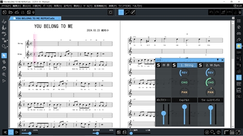 ●パソコンならこんなことができます。 雑誌や書籍の譜面をスキャナで読み取って、主旋律と複数パートに分離、好みのバンド演奏に編曲できます。 全パート演奏を聞いてメロディーを覚えた後、主旋律をミュートし、そのパートを自分の楽器で代わって演奏するという練習は どうですか。 カラオケ画面のように楽譜上に進行位置マークが出ます。 みんなで合奏のときも、足りないパートが居たらパソコンに演奏させましょう。 |