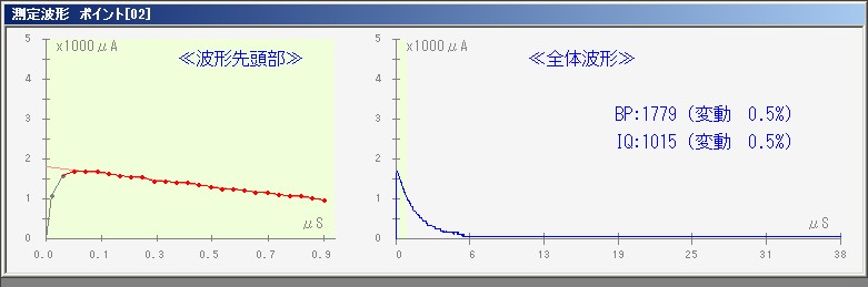 新装置(E-BI2)では、読取装置の信号入力部にフィルター回路を入れました。これにより、ノイズ混入の影響が少なく波形が安定し、BP値の推定精度が向上し ました. 左図は、同一条件(1.5kΩ+1000pFの試験回路)を2回測定したものです。 BP値の推定は、測定値がピーク値から一定割合低下した点まで、最小2二乗法 による回帰線により電流のピーク値を推定しています。 |