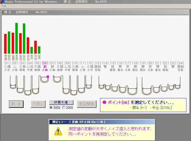 繰り返し測定した2つの測定値の変化がBP値の特徴を示していない場合、電極が井穴皮膚に正しく密着していないと判定できます。 また、2つの測定値の変動が大きい場合、ノイズ混入や不安定な操作があったと 判定できます。 このような測定値不正と判定された場合、再測定を促すメッセージ画面を表示します。 再測定メッセージには次のようなものがあります。