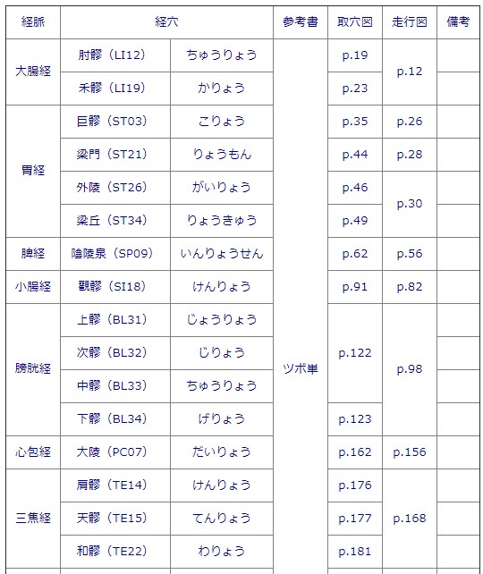 市販書籍「ツボ単」(2016.12.28 初版 第10刷 株式会社エヌ・ティー・エス発行)の目次情報が登録されており、検索されたツボ名と共に「ツボ単」の解説ページ番号が表示されます。