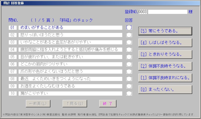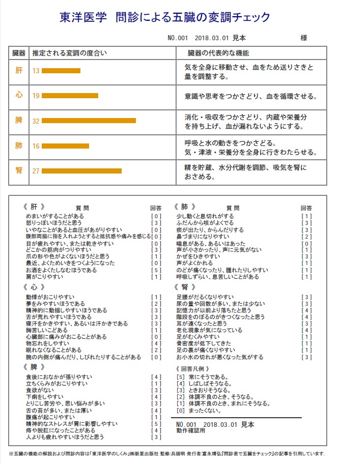 - 「東洋医学 問診による五臓の変調チェック」プログラム 2018.03.28 東洋医学的見地で被検者の体質判定のための50項目の 質問 が出題されます。