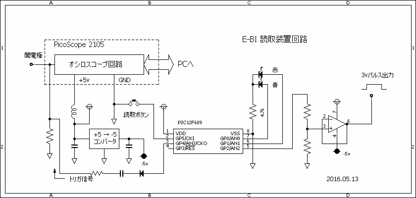 読取ボタンが押されると、PS2105にトリガ信号が印加され、約1μs後、3vパルスが出力されます。