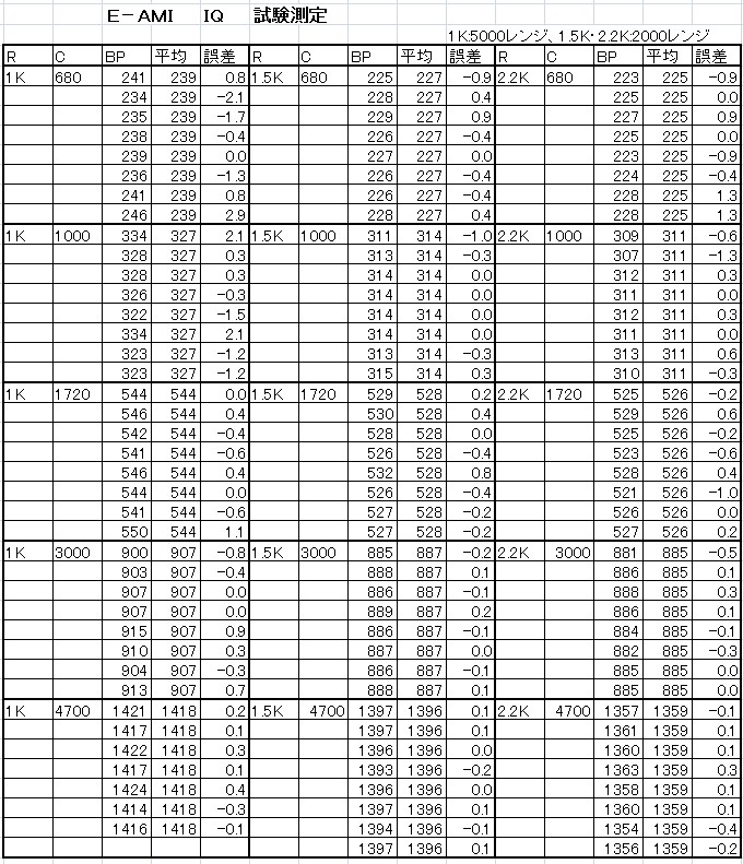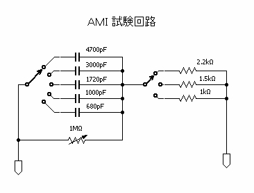 試験回路は人体の等価回路です。 回路内コンデンサーは、IQ値のもとになる皮膚の静電容量に相当します。抵抗器は、BP値のもとになる皮下組織の経絡反映部位の抵抗に相当します。 E-AMIの測定電極に人体の代わりに試験回路を接続し、各種コンデンサー・抵抗の組み合わせで測定操作を実行しました。 |