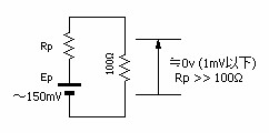 ・次に、上記2種類の電極間に100Ωの抵抗(*3)負荷をかけて、電圧測定する。 すると、デジタルテスターの表示が0mV(1mV以下は表示されないため)になりました。 *3:AMI測定は、人体皮膚に100Ωの抵抗を介して3Vの直流電圧をかけ、100Ωの両端の電圧を測定するという仕様である。 |