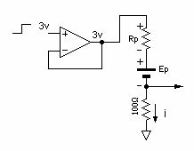 上記1.5msが経過して3Vパルスが終了すると、オペアンプ+側入力は0Vになり、出力を0Vに維持します。 すると今度は、分極部の起電力Epにより、100Ωの抵抗には、上図とは逆方向に電流iが流れます。 つまり、“充電”された起電力Epが放電されることになります。 |