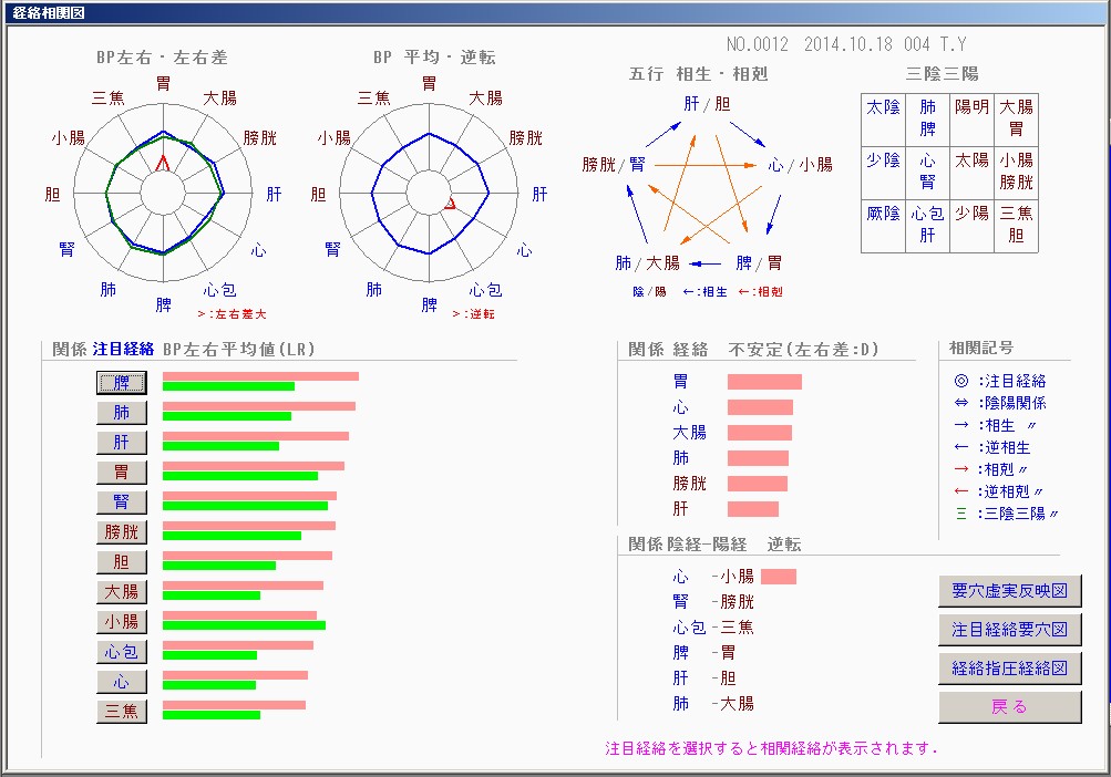 ↓ 上図測定結果で虚実に注目し、例えば、最実経絡である「脾経」を選択