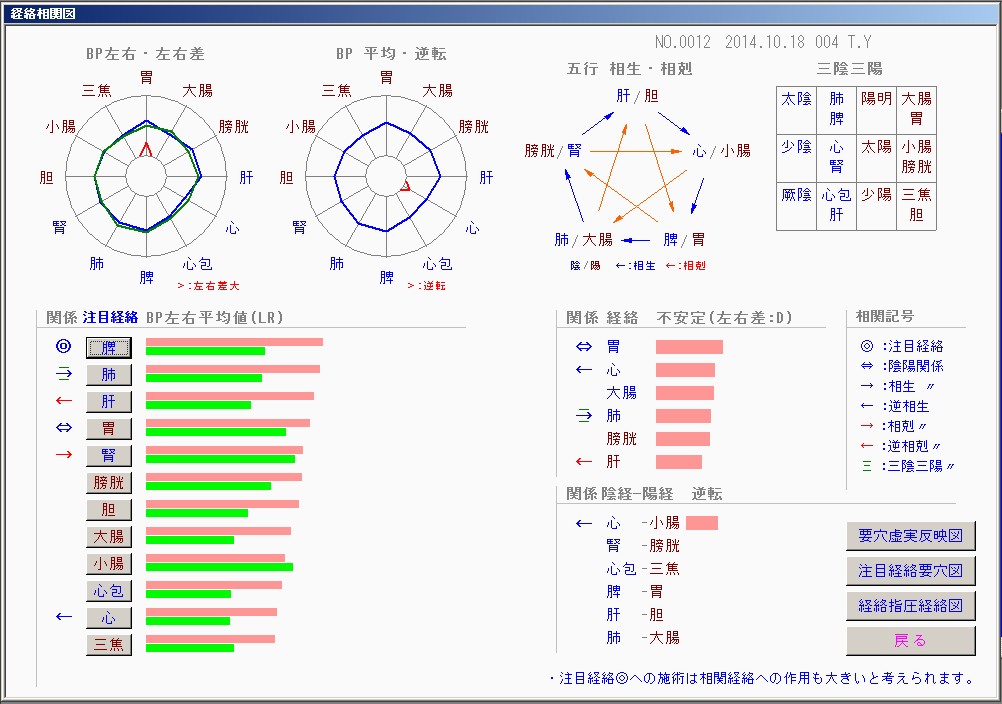 この被検者は、「心経−小腸経」(の本来あるべき測定値の大小関係)が「逆転」しています。