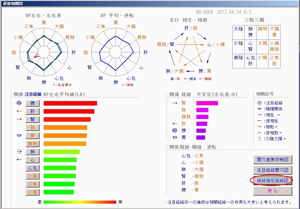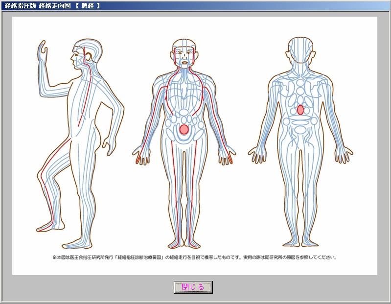●経絡相関図の画面に「経絡指圧経絡図」ボタンを追加しました。 ●「経絡指圧経絡図」ボタンをクリックすると、経絡指圧の経絡走向図が表示されます。 経絡指圧の経絡は、鍼灸の経絡とは走向が違います。 鍼灸の経絡は、手に6経、足に6経、合わせて12経ですが、経絡指圧の経絡は手にも足にも12経ずつあります。 経絡測定後の診断の参考になりそうなので表示できるようにしました。 ●参考 経絡指圧とは