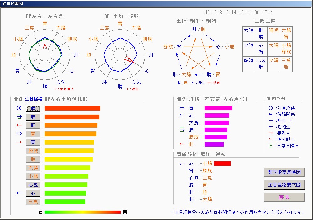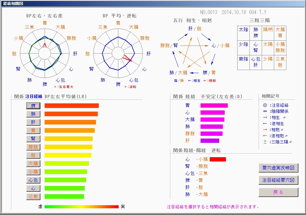 この被検者は、「心経−小腸経」(の本来あるべき測定値の大小関係)が「逆転」しています。