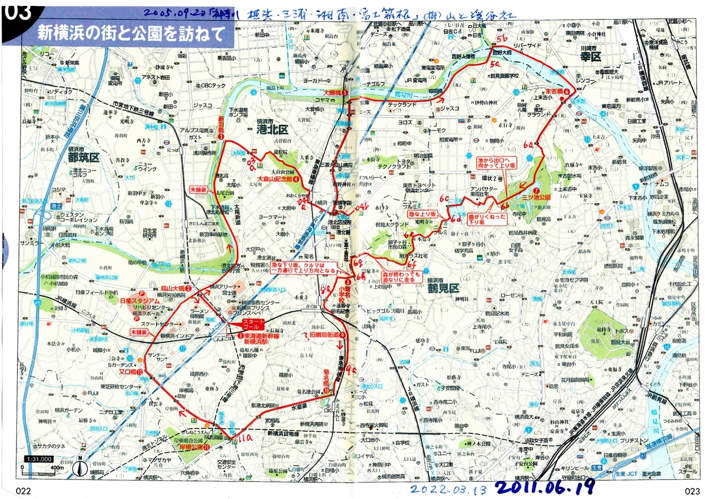 ガイドブックは2005年9月発行のものです。サイクリングに出かけるときは、該当ページの地図をコピーして持参し、帰宅後に日付を記入して保管してました。"2011.06.19"と記入してあるので、その日に出かけていたようです。