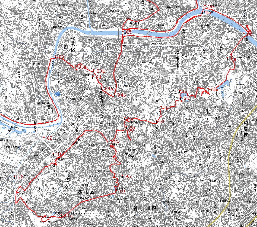 そして翌日13日、今度は東横線の綱島駅まで電車で出かけて、その場でレンタサイクルを借りました。そして、地図の(6)以降のルートを走行し、新横浜の駅近くのダイチャリステーションで自転車を返却しました。