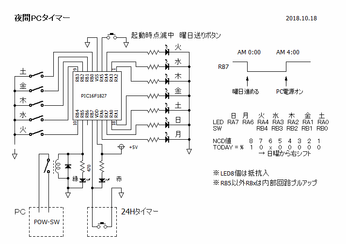 そこで、営業日の翌日だけ起動できるように、いままでの24時間タイマーにマイコン回路を付加して、週間タイマーに改造しました。